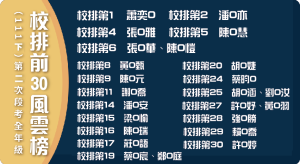 第二次段考 風雲榜 登場 / 最新消息 第二次段考 風雲榜 登場 國一校排前10 育昇佔” 5 “名 校排前30共計” 1 3 “名 國二校排前10 育昇佔” 3 “名 校排前30共計” 1 1 “名 榜單,絕非偶然 成績,才是教學保證 恭喜本次段考獲得佳績的同學們,相信所有齊聚在育昇的學生都能遇強則強,互相砥礪,自信地走在學習的路上,為自己感到驕傲 也歡迎其他想讓自己變得更強的同學加入我們,站上風雲榜